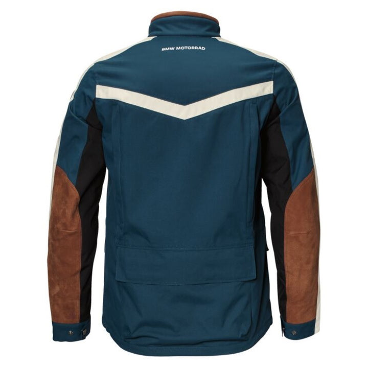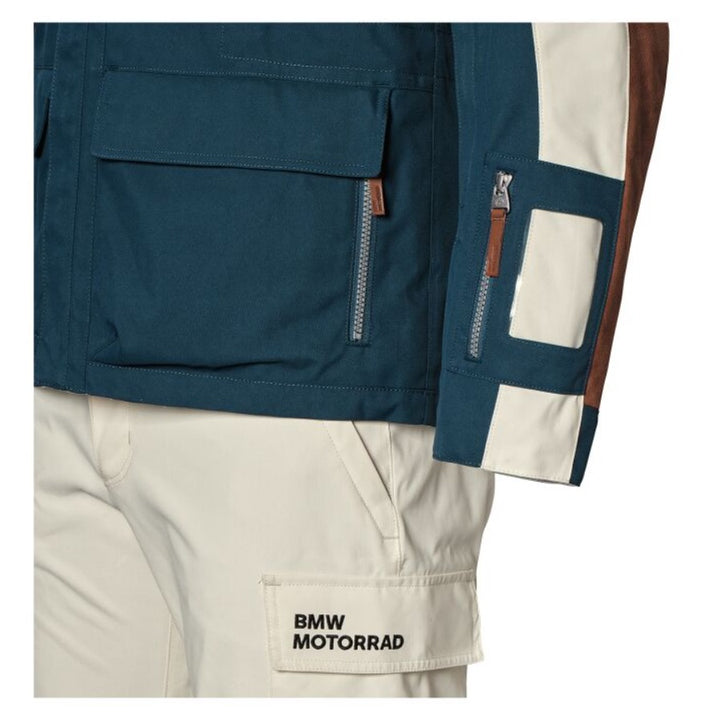 Details wie Skinne -Anwendungen an Ellbogen und Kragen Verleiht der Jacke einen exklusiven, robusten Look mit einer klaren Verbindung zu BMWs Abenteuererbe.