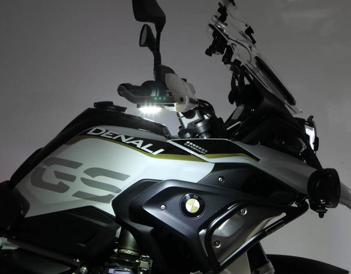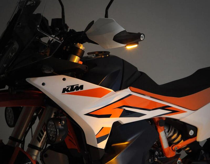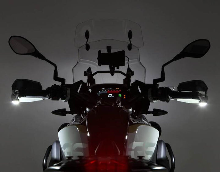 Die T3-Signal-Kapseln des Kits werden an der Außenseite der Handguards montiert, nach unten zur Fahrbahn gerichtet. Dies schafft einen Lichtkranz rund um das gesamte Motorrad, der aus allen Winkeln sichtbar ist – auch von der Seite und aus der Luft.
