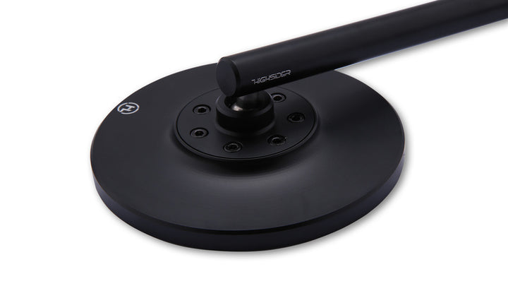 Eleganter CNC bearbeitete Universal Mirror mit einem runden anodierten Aluminiumkopf in schwarzer oder mattem Schwarz. Dank der Verwendung eines zweiten Gelenks im Griff gibt es zusätzliche Anpassungsmöglichkeiten für Ihre Sicherheit.