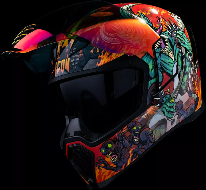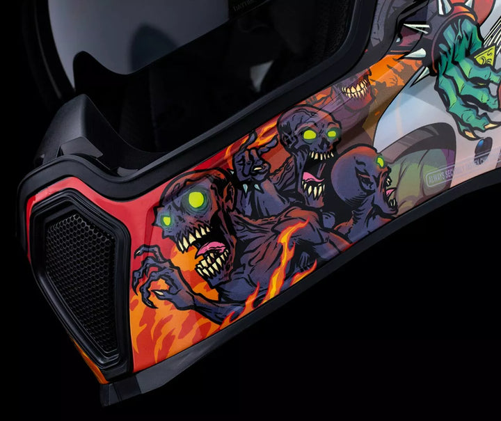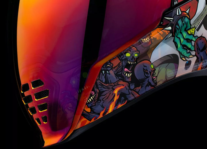 Abnehmbare geformte Atemablöser und Kinnvorhang, Injektionsform geformte Polycarbonat-Hülle für Festigkeit, Fag-freie Dropshield ™ mit Außenschalter, eingezogener Zwillingskanal-Kühlsystem, mehrere übergroße Einlassanschlüsse Seitenplatten. Icons R.A.U. Das Bluetooth-Gerät umfasst Clear & RST Sunset Nebelfreies Fliteshield