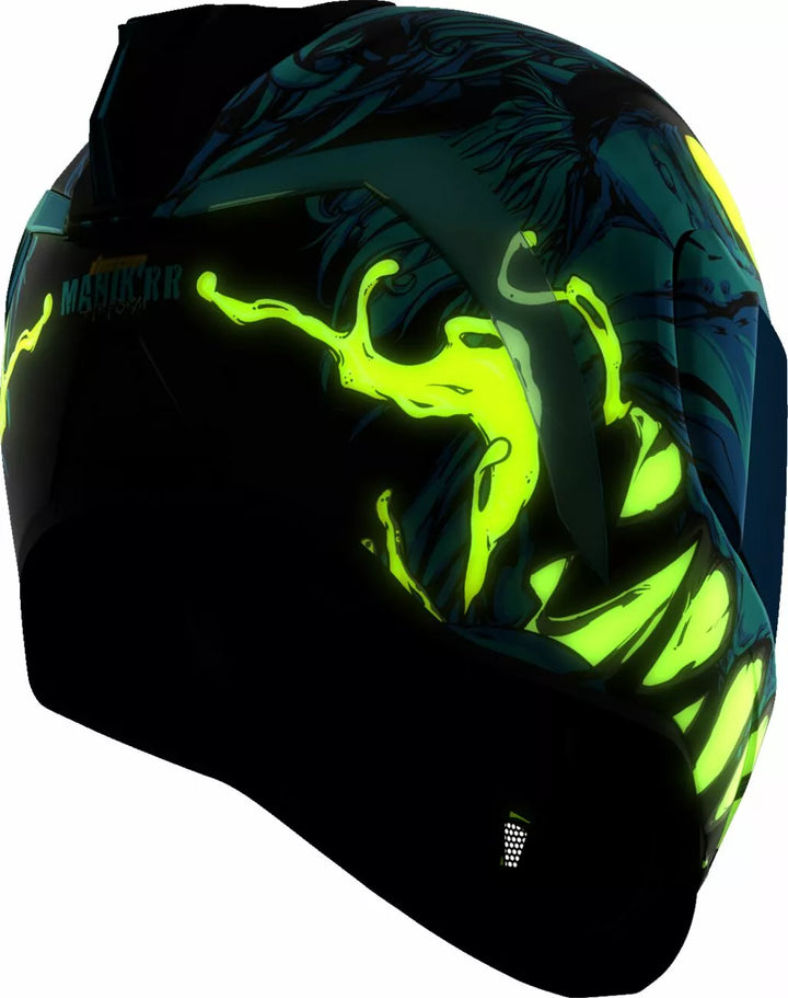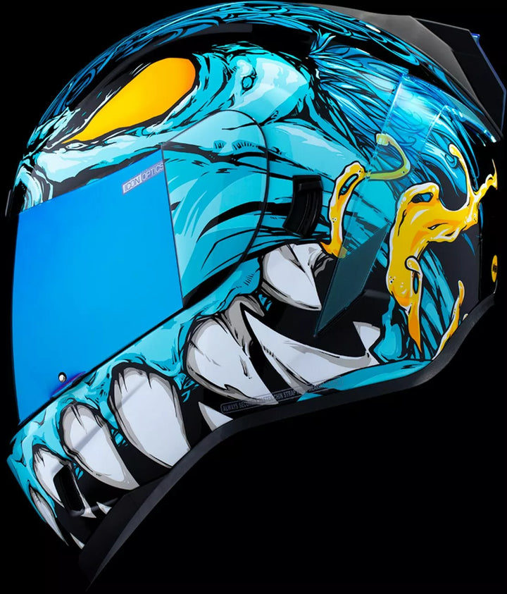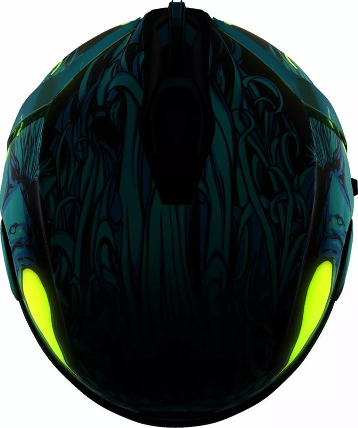 Kontinuierliches Entlüftungssystem, Fag-Fag-freie Icon Optics ™ Shield mit Rapid-Release ™ -System, inspritzgeformte Polycarbonatschale für Festigkeit, interne Luftstromgeometrie, geformtes Halsrolle, Prolock ™ -Schitsch, das Äußere mit locking Shiving Swales Visor muss nur verwendet werden, während der Hauptgesichtsabschild in der voll geschlossenen Position in der Lage ist, in der Lage zu sein. Wicking Liner, interne Lautsprecher -Taschen arbeiten mit Icons R.A.U. Das Bluetooth -Gerät umfasst Dark Smoke Dropshield ™ und Rubaton Black Speedfin ™