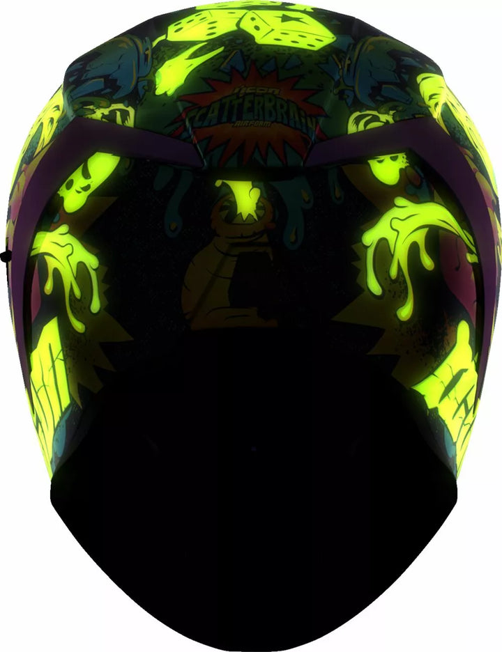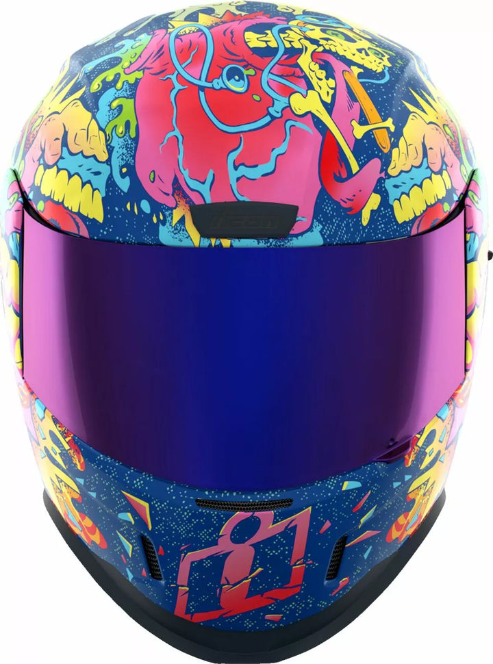Injection Molded Polycarbonate Shell for Strength, Internal Airflow Geometry, Continuous Venting System, Sculpeed NECK Roll, FAG-FREE ICON OPTICS ™ Shield with Rapid-Reale ™ System, Prock ™ Positive Shield ™ Writing System, Internal Drop High Visor must only be used while the main face shield is in the fully closed position, removable Molded Breath Deflector, Removable Hydradry ™ 3-Piece Moisture Wicking Liner, interne Lautsprecher -Taschen arbeiten mit Icons R.A.U. Das Bluetooth -Gerät umfasst Dark Smoke Dropshield, umfasst Clear & RST Purple Optics Shield ™
