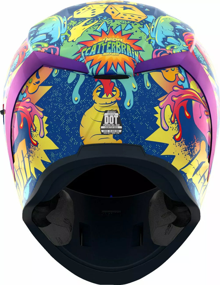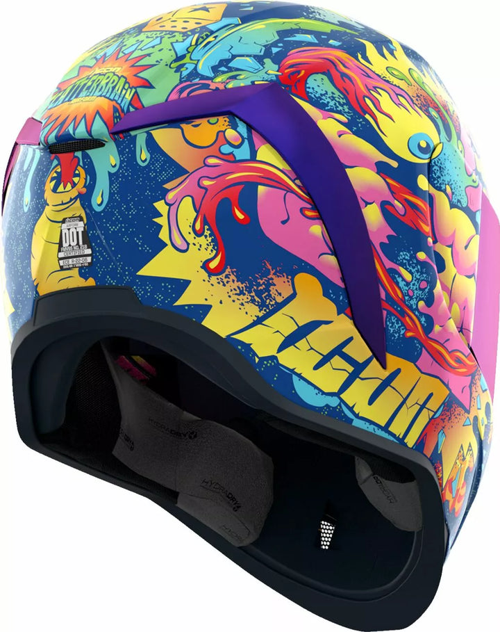 Injection Molded Polycarbonate Shell for Strength, Internal Airflow Geometry, Continuous Venting System, Sculpeed NECK Roll, FAG-FREE ICON OPTICS ™ Shield with Rapid-Reale ™ System, Prolock ™ Positive Shield Locking System, Internal Drop High Visor must only be used while the main face shield is in the fully closed position, removable Molded Breath Deflector, Removable Hydradry ™ 3-Piece Moisture Wicking Liner, Interne Lautsprecher -Taschen arbeiten mit Icons R.A.U. Das Bluetooth -Gerät umfasst Dark Smoke Dropshield, umfasst Clear & RST Purple Optics Shield ™