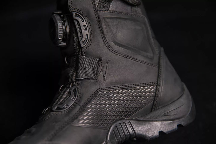 Premium Leder Upper verfügt über eine wasserfeste Finish, atmungsaktives Ereignis, wasserdichte Liner helfen, trockene, hochschledigte Öl/ Schlupf-resistente Gummi-Außensohle trocken zu machen, die motorradische Leistung mit offener Zellpolyurethan-Einlegesübung Füße, BA, bietet. Bequeme Passform, Dual D3O® -Einsätze liefern Knöchelabdeckung, verstärkte Gummi -Zehenkappen, reflektierende Fersenakzente und Schalthebel -Grenzflächen -Nubs