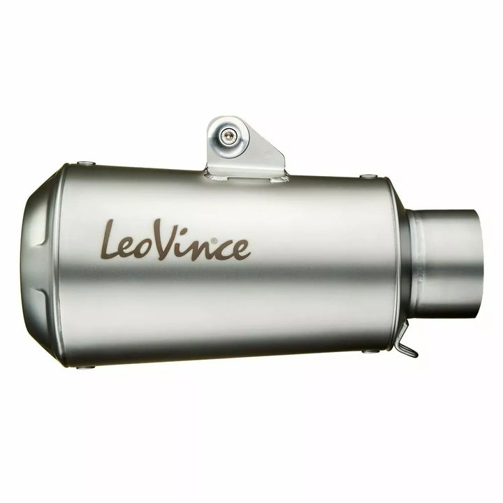 LV-10 Slip-on Muffler Edelstahl mit Renn-DNA, AISI 304 Edelstahl, Schuss-Spreng-Endkappe, mattes Finishing, Heck-Edelstahl-Netz, Lasergeätzer Leovince-Logo, Laserschnitte-Halterung, hohe Temperatur "