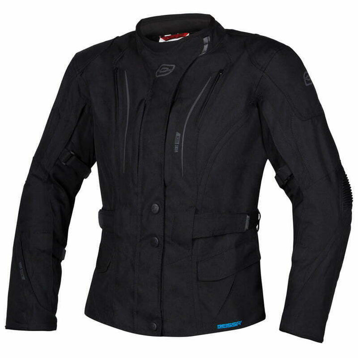 Die Motorrad -Touring -Jacke für Frauen verfügt über eine wasserdichte, abnehmbare REISSA® -Membran, die vor Wind und Regen schützt. Es hat acht Ventile vorne und zwei hinten. Es verfügt über den Ellbogen und die Schulterabdeckung von CE Level 1 und eine Tasche auf der Rückseite, in der Sie einen Schutz hinzufügen können.
