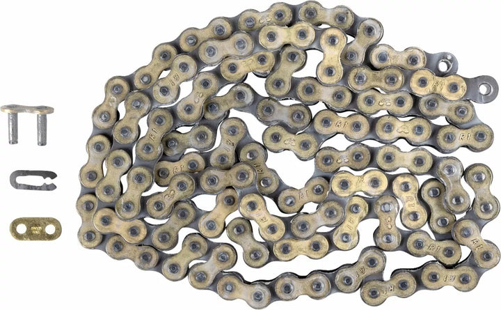 Eine Mini-Version der 520 R1-Kette von Renthal für die heutigen hochleistungsfähigen Mini-Rennmaschinen, geschlagene Legierungsstahl-Seitenplatten, ultrahohe 4.609 lb. Durchschnittliche Zugfestigkeit, verchromte Lagerstifte widerstehen Verschleiß, vorgeformte Buchsen verteilen Kraftbelastungen gleichmäßig für eine größere Kettenlebensdauer, goldene Seitenplatten; Kupferfarbene Walzen, die perfekte Übereinstimmung für Renthal-Kettenräder, Clip-Link enthalten, EU: Ultrahohe 2090,61 kg durchschnittliche Zugfestigkeit