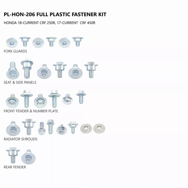 Beinhaltet alle Werksreplik -Verbindungselemente und Buchsen für Frontkotflügel, hintere Kotflügel, Frontnummernplatte, Gabelwächter, Sitzplatten, Seitenwände und Kühlerscharnern in einem Satz
