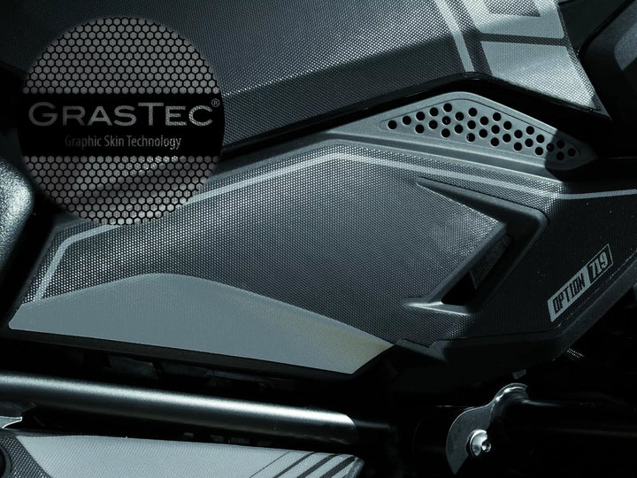 Set resistenter Aufkleber, die schützen und dekorieren, die Klebstoffe bestehen aus einem Material mit hohem Beständigkeit gegen Reibungen. Mit einem exklusiven Graw, das ihm ein sehr attraktives mathematisches Erscheinungsbild verleiht