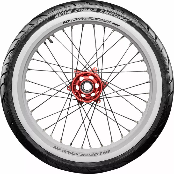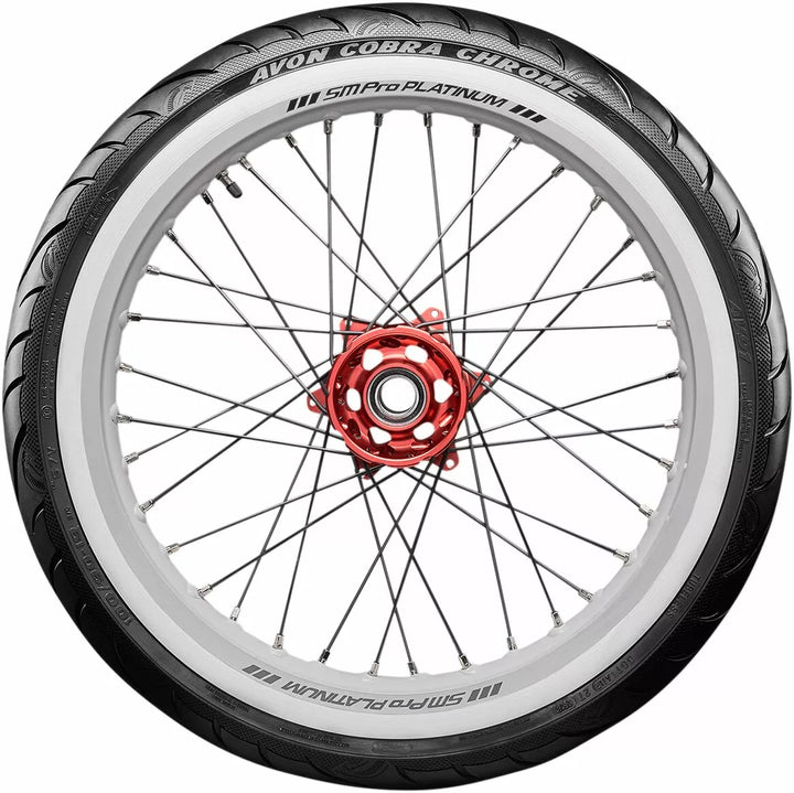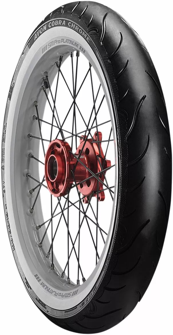 Avon's Latest Tech Pattern and Advanced Construction Produces Over A 5% Larger Footprint Compared To Avon Cobra, High Stability In All Conditions Deliveness Precise Feel and Tire Feedback, Better Traction and Shorter Stopping Distances, Even in the Wet, Incorporates Sports Tirive Longevity ヨ Perfect for Touring, Unique Tire Design with Detaileled Aesthetic Features, Improved Tire Life Over ITS Precessor, Snakeskin-Effect Treat, Aimed at the Power Cruiser/Touring/Custom Market.