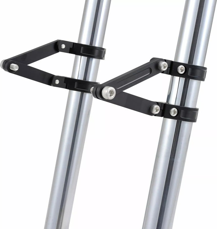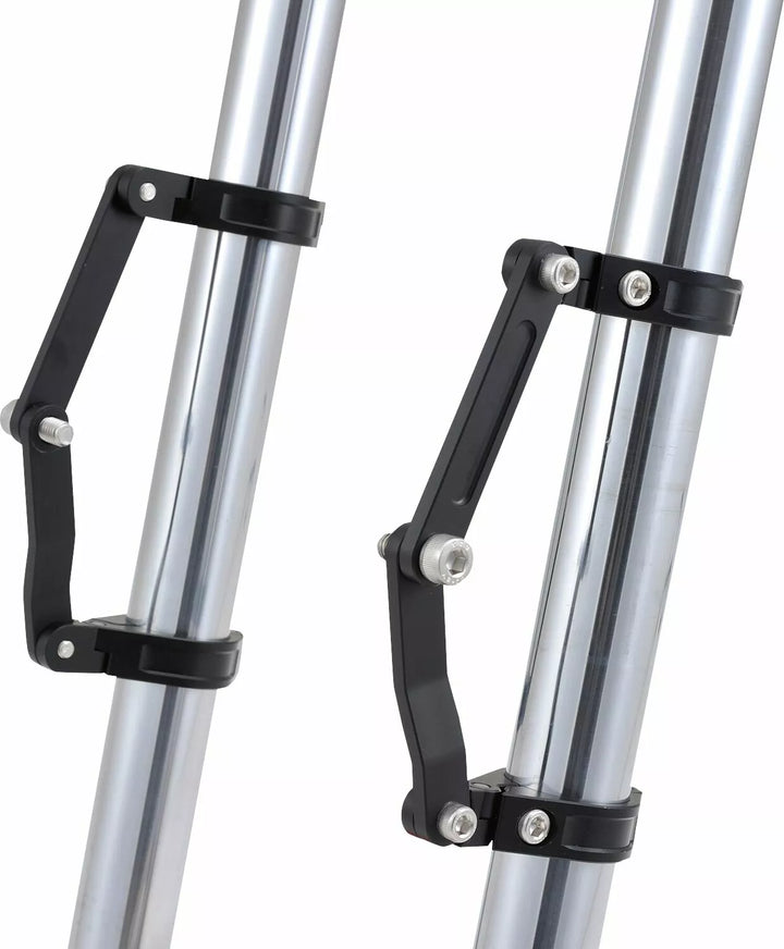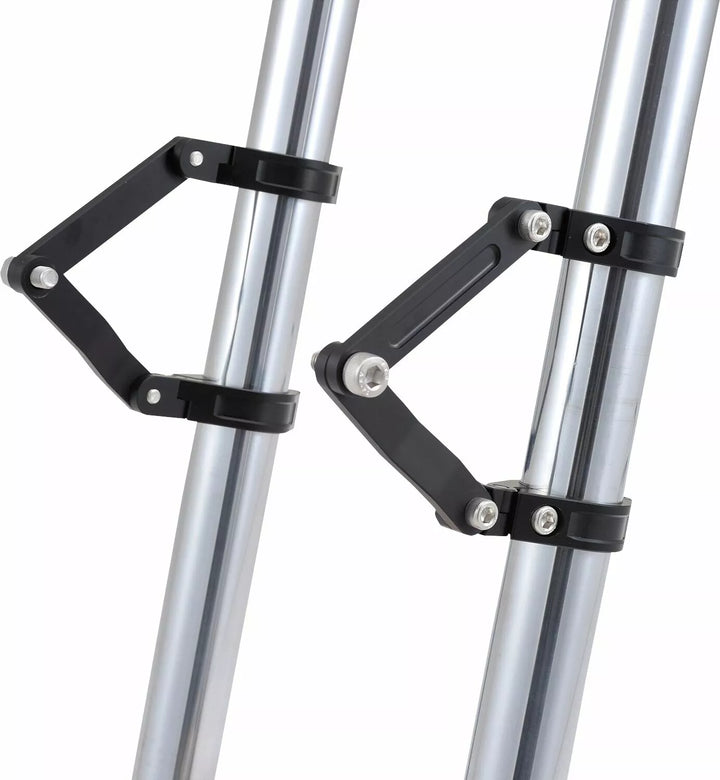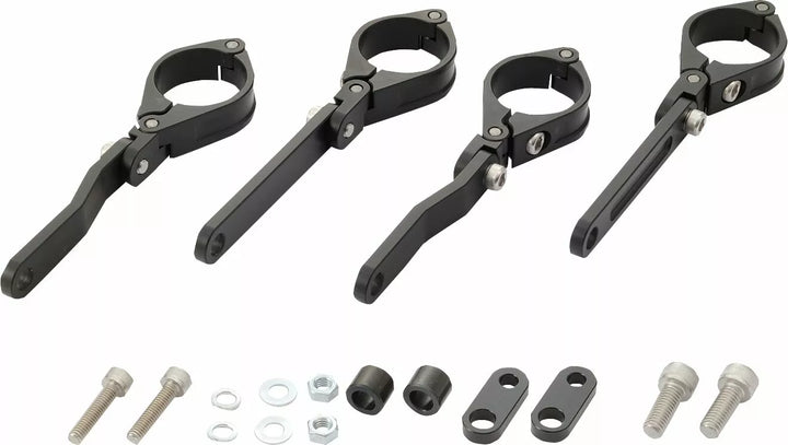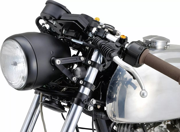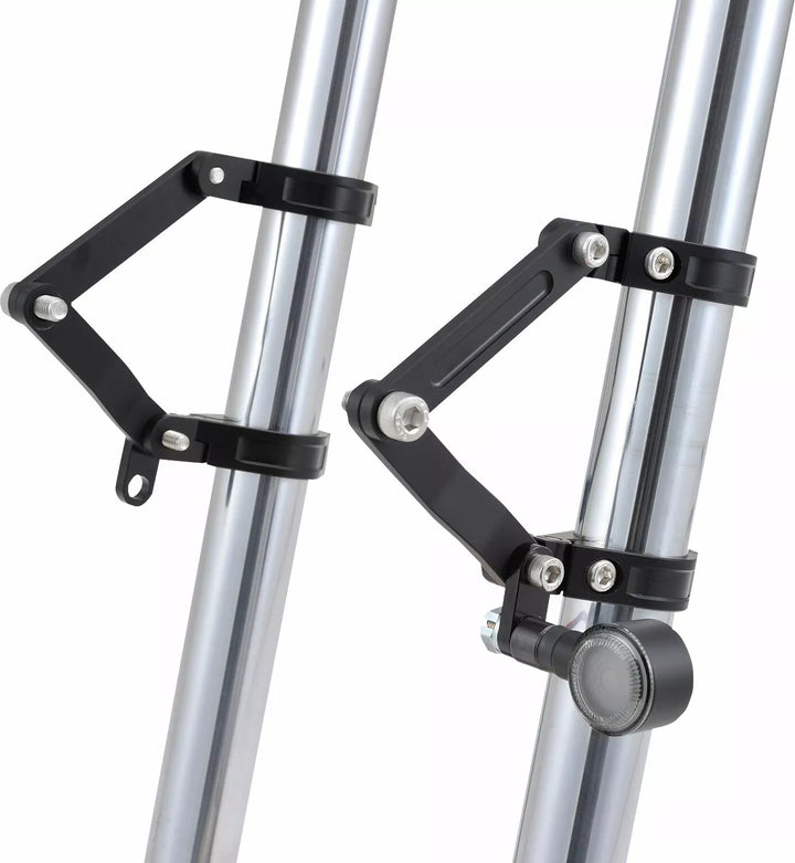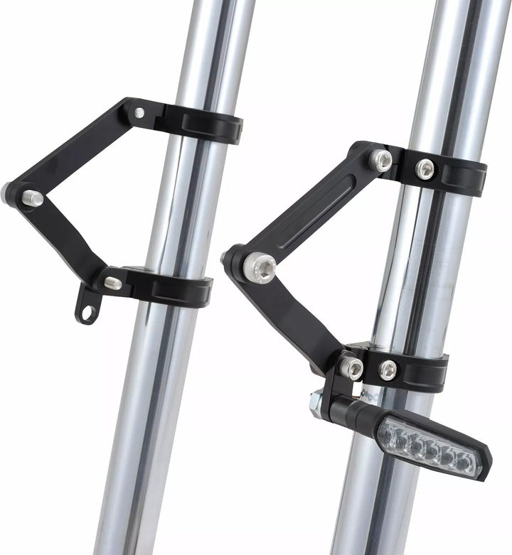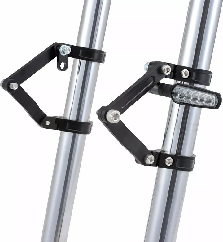 Adjustable Dual-Axis Headlight Bracket Made of CNC Machined Aluminum in Black, The Fork Clamp Can Be Adjusted Vertically, Allowing the Headlight Position to Be Adjusted In The Front-Back Dire M8 Indicator Mount Kit Is Included for Discreet Installation