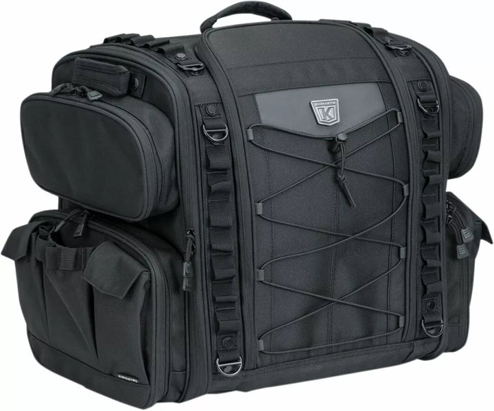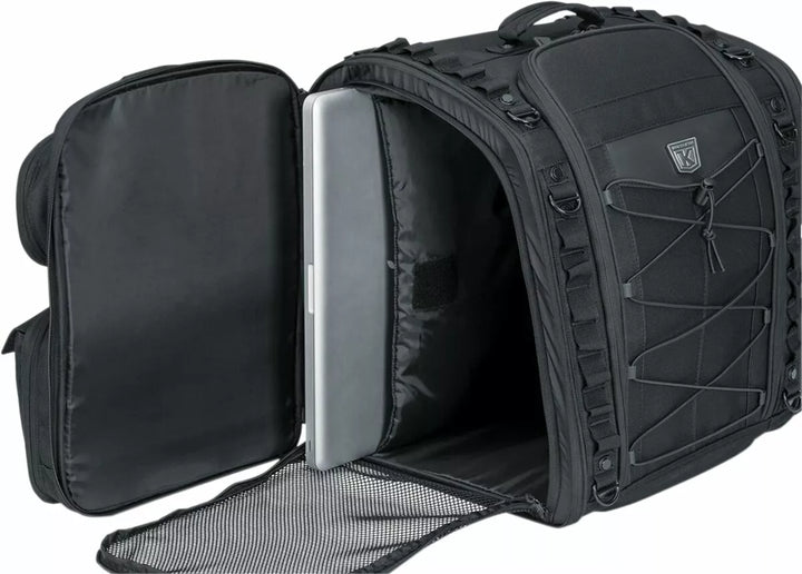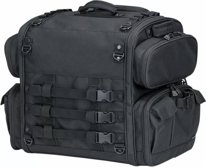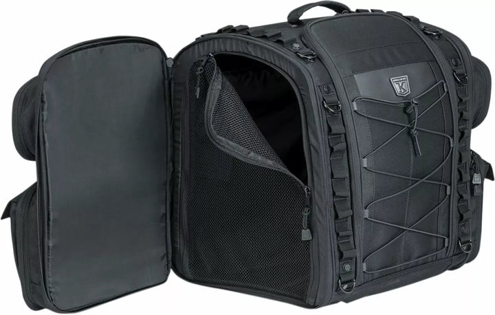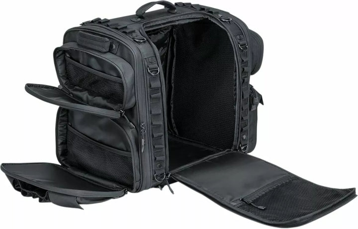 Made from UV-rated, Weather resistant 1200 Denier Textile Material, Durable Structure Maints Shape Even When Empty, Wide Center Hatch Opening With Zippered Side Swing Access Doors For Convenient Cargo Access, Customized Versatility With Eight External Stase With Eight External Stas Pocket for up to 15 "laptops or tablets, internal zippered mesh pocket on the center hatch keeps smaller items organized, external bungee storage system for coats, bedrolls or other items, quick-mount sissy bar strap design, plus full mounting strap kit for variety D-Ring for Secure Mounting Options, Integrated Molle Modular Attachment Options, Includes Removable Shoulder Strap and Low-Profile Carrying Handles for Easy Transport Off The Bike, Includes Tethered Rain Cover for Added Protection From The Elements