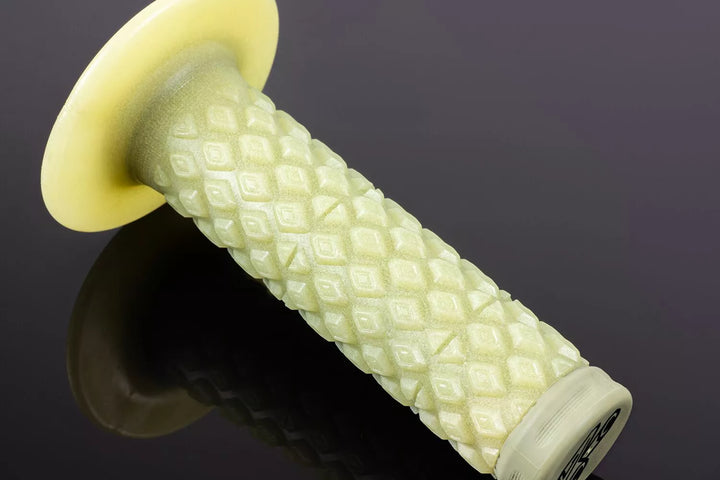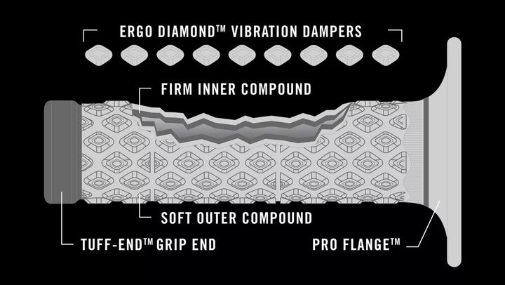 Ergo Diamond ™ Vibration Dampers, Soft Outer Compound and Firm Inner Compound, Tuff-end ™ Grip End, Pro Flange Created to Reduce Inboard Thumb Abrasion Based on Extensive Rider Feedback
