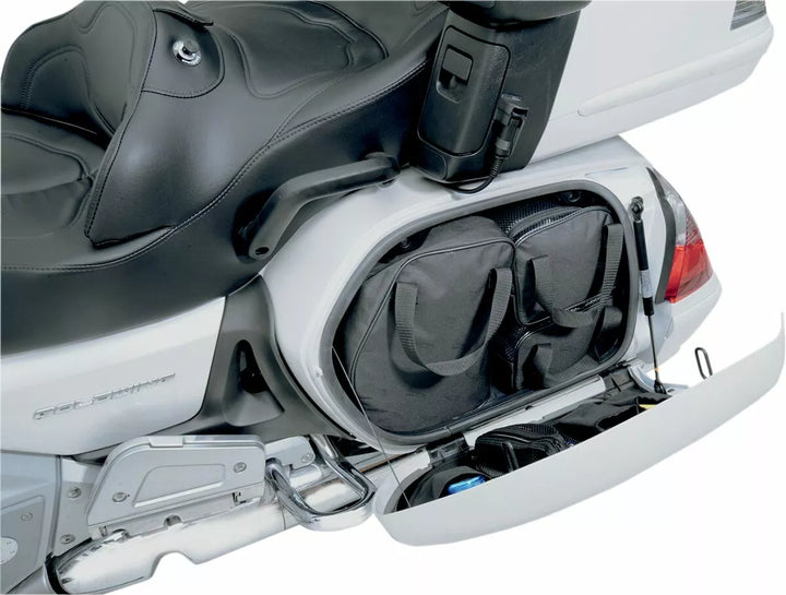 Four-piece liner set includes one full-size liner bag matched perfectly to the shape of your GL1800 saddlebag plus one vertically oriented half-size liner used in conjunction with two quarter-sized horizontally oriented liner bags that stack neatly together in your other saddlebag, Unique Design Permit's Efficient Organization of Your Belongings -Separate Your Laundry or Keep Rider and Passenger Gear Divided While Maximizing the Capacity of Your Saddlebags, Top Sections of the Quicter -Sized Liner Bags Are Transparts and See You CON CON CON CON CON CON CON CON CON CON CON CON CON CON CON CON CON CON CONCERING THE TANS Perfect for Items You Need to Grab When You Are On The Road, Made From Light, But Durable Pvc Lined 150-The -Menier Polyester with Sturdy Zippers That Permit Over Packing But Keep The Elements Away From Your Cargo, Simple For Trips, Overnights, Organizing You Liners Out of the Saddlebags to move your cargo Easily into the hotel, campground or to unload fixed once you are home, bags measures: complete set measures: 19 "x 7" x 12 "(Larger liner); 9" x 7 "x 5-1/4" (Medium Liner); 9 "x 7" x 6-1/4 "(Small Liner)