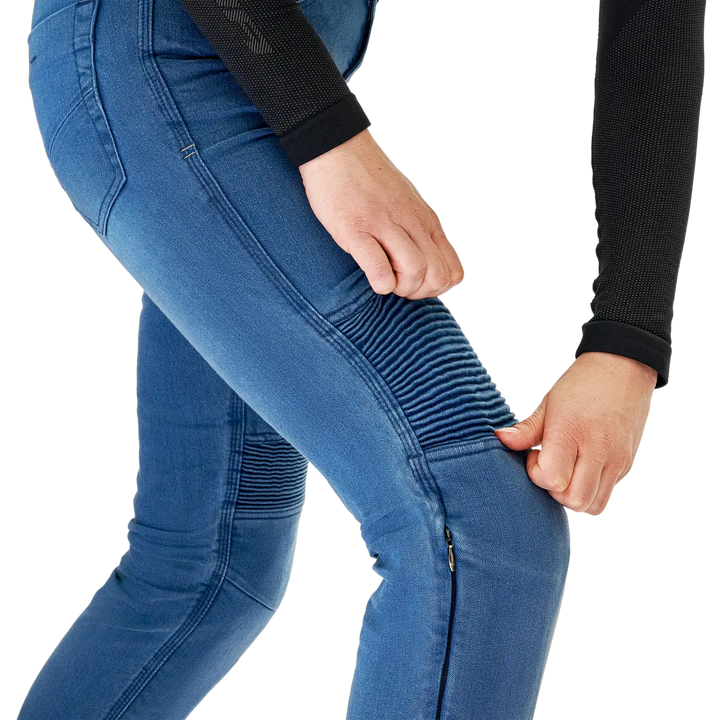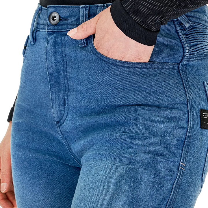 The pants are equipped with Airforce-CHAIR (Level 1) and height-adjustable GFlexx-Knäsk protection (Level 2) Like sitting in Outer pockets - Which makes it easy to adjust them without removing the jeans. Lady Fit pass form Is tailor made for female anatomy and combines stylish silhouette with freedom of movement. Stretch panels and harmony weeks over the knees and during the waistband, flexibility further increases.