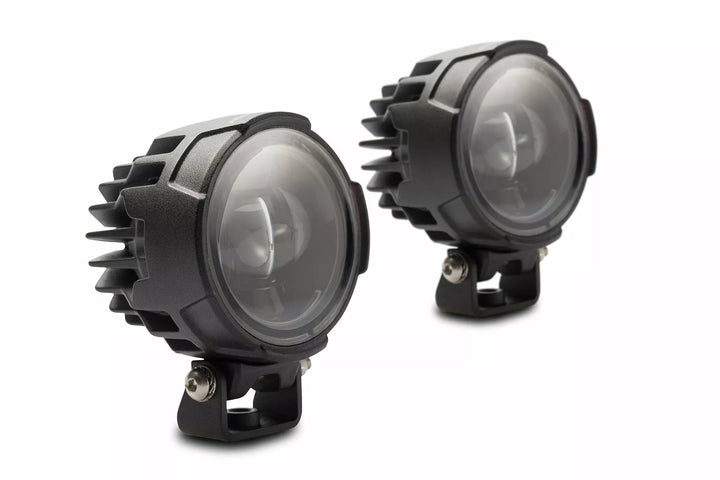 EVO High Beam Lights are ideal for riding long distances in/off road conditions where maximum beam distance is desired to increase visibility and safety, evo lights represented outstanding design, high-quality standards and reliable waters and dust protection (IP69) Trouble-free and maintenance-free operation for years, Trouble-free and maintenance-free operation through wear-free LED, Consuming Significant Less Power, Input Voltage: 12 V DC, LED: 12 W (Per Light), Luminus Flux Flux Outer diameter: 7.1 cm, Water and Dust Proof (IP69), Connects Directly to the Motorcycle, No Changes on the Motorcycle Electric Necessary, Weatherproof, Illuminated Blue Handlebar Switch for Easy Hand 27, 28 mm) or on bike-specific light Mounts for Frame Mounting (Sold Separately), Included: 2 Evo High Beams, Cable Harness with Fuse, Switch, Mounting Material