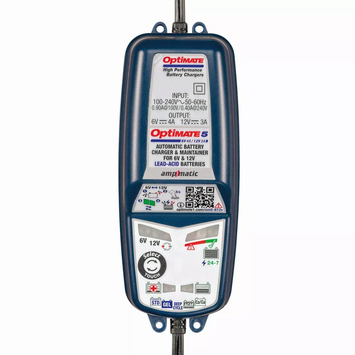 OPTICATE 5 6V / 12V Silver Series: 8-STEP 6V 4A / 12V 3A Sealed Battery Saving Charger & Maintainer., The Smarts Charger for All 6V and 12V LEAD-ACID Batteries-Great for Deep Cycle Batteries!, Ideal for 6V and 12V Batter) Leaf Cycle and Starter (SLO) Craft and Equipment Above., Select the Right Charge Voltage for Your 6V or 12V Lead-Acid Battery-Selection Remains in Memory Even IF AC Power is Lost., Fully Automatic Multi-Step Program Bring The Battery Soday to Full Charge-Connect-Connect-Connect-Connect-Connect-Connect-Connect-Connect-Connect Required!, ampmatic: Automatically Adjusts Current to Match Battery Size and Condition., Safe to Leave Connected. Full Electronic Protection., 24/7 Maints Battery at Full Charge and Good Health., Saves Your 'Dead' Battery From As Low as 0.5v., S.O.H.: Tests Battery State of Health. Requires User Confirmation., Green Technology: Energy Saving Technology, Stand-by Power Less Than 0.5w and Efficient 24-7 Battery Maintenance., IP54: Weatherproof. Rated for use down to -40 ° C / -40 ° f.