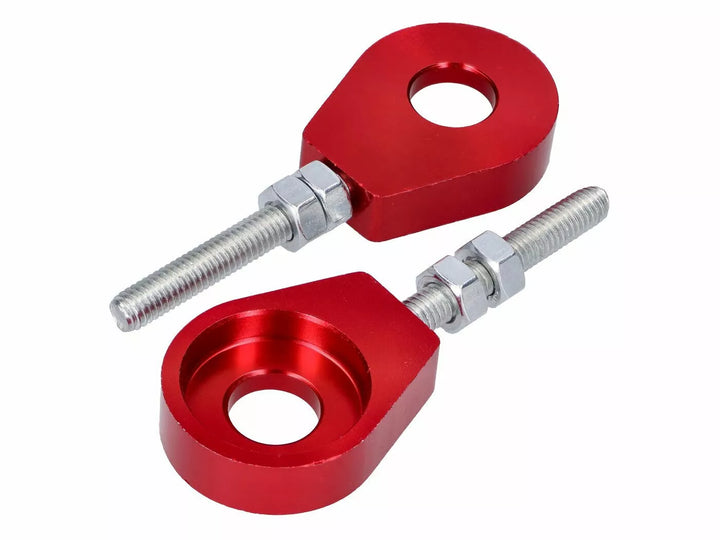 Tensions de chaîne en aluminium anodisées Ensemble de 2 pièces adaptées à l'essieu arrière motor / mokick avec 12 mm de diamètre. L'ensemble est livré avec des écrous de verrouillage M6., Longueur globale: 75 mm, diamètre du trou: 12,5 mm, filetage: M6, longueur de filetage: 40 mm