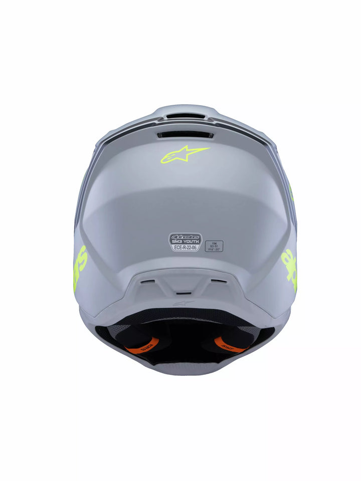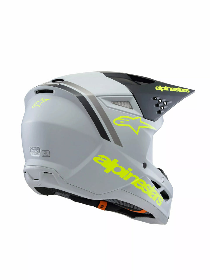 Anatomiquement conçu et profilé spécifiquement pour les jeunes et les plus jeunes, le tout nouveau casque de jeunesse SM3 est optimisé pour MX, Enduro et utilisation hors route. et la tête des jeunes. La doublure intérieure de la densité garantit que le casque est équipé de la densité de corractation dans la zone de corrac pour une absorption d'impact améliorée, tout en aidant à réduire les effets du poids orienté des impacts obliques., Alpinestars brevetés à faible frottement est appliqué à la partie intérieure de la palette EPS principale pour réduire les forces d'accélération rotationnelle qui peuvent résulter de certains impacts obliques. Impacts., Systèmes de libération des visiteurs de brevets La visière est libérée avec la bonne quantité de force prédéterminée, une analyse efficace réduisant la conduite. Les nouvelles normes d'Alpinestars, l'épaisseur de la coquille et la structure de la conception du casque elles-mêmes ont été optimisées sur la zone du menton pour des performances d'impact supérieures., équipées d'un système de libération d'urgence et amovible. Sept ports d'échappement., La visière a été conçue pour diriger l'air dans les ports pour un flux d'air amélioré.