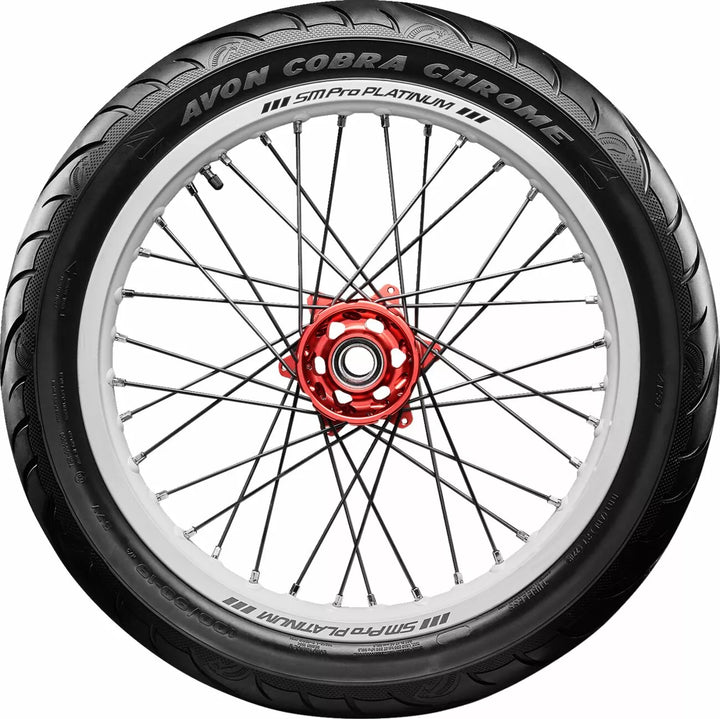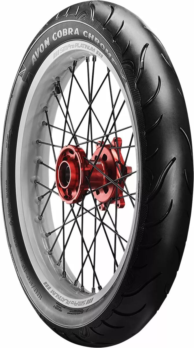 Avon's Latest Tech Pattern and Advanced Construction Produces Over A 5% Larger Footprint Compared To Avon Cobra, High Stability In All Conditions Deliveness Precise Feel and Tire Feedback, Better Traction and Shorter Stopping Distances, Even in the Wet, Incorporates Sports Tirive Longevity ヨ Perfect for Touring, Unique Tire Design with Detaileled Aesthetic Features, Improved Tire Life Over ITS Precessor, Snakeskin-Effect Treat, Reinforced, Aimed at the Power Cruiser / Tours / Market Custom.