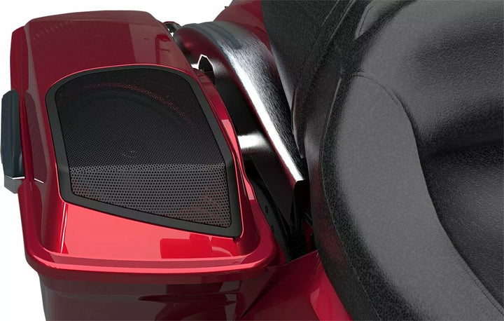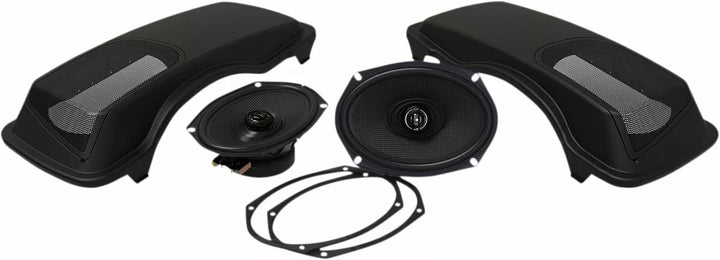 Des haut-parleurs inclinés vers le cavalier pour le meilleur son, comprend 200 watts 2 ohm xl série 6x9 ヤ Les haut-parleurs conçus pour l'environnement de moto (200 watts par haut-parleur), le système de drainage d'eau intégré maintient tout sec, de haute qualité / à fort impact ABS Remplacement des couvercles de sacs de selle, est en noir mat, prêt et prêt pour la peinture, les grilles de maill Dans tout ampli Hogtunes actuel ou autre ampli, travaille avec OEM et la plupart