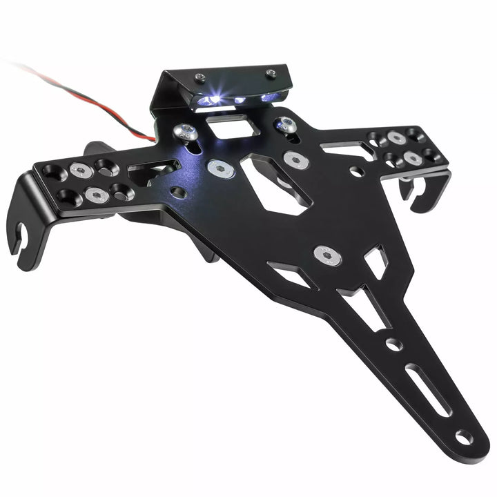 Le support de plaque d'immatriculation est extrêmement durable et à l'épreuve des intempéries., Black Powder enduit. , Le support de plaque d'immatriculation peut être utilisé pour tout type de plaque d'immatriculation (largeur de 175 mm)., Aucune modification du carénage requise., Réglage sans étape de l'angle de râteau., Prise en charge de l'indicateur réglable en 3 positions. Plaque., Supports d'éclairage indicateur spécial (vendus séparément) requis pour les voyants d'indicateur de stock., Kit comprend: 1 porte-plaque d'immatriculation incl. Kit de montage., Light Plaque d'immatriculation LED "E Approsved" incl. Support., Back Light avec support. De: Allemagne, Slovénie, Croatie et Royaume-Uni.