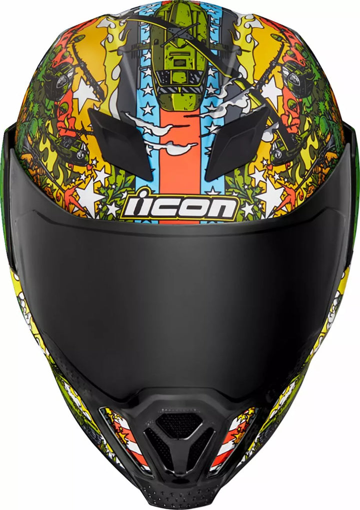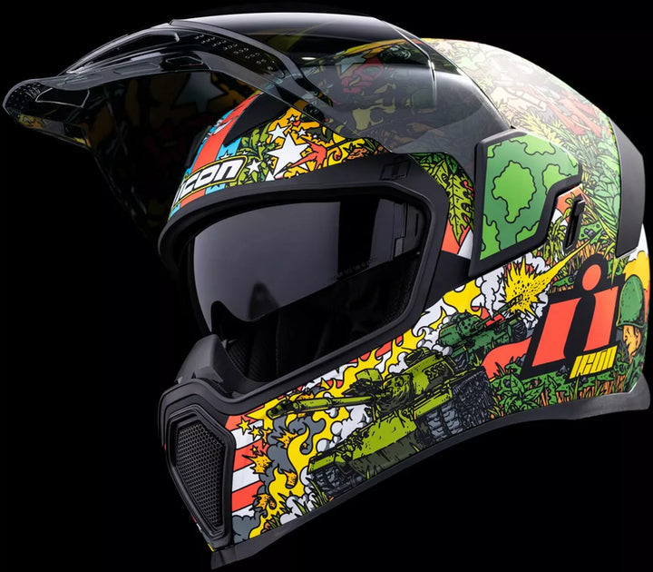FliteShield ™ sans brouillard à changement rapide avec plaques latérales, coque en polycarbonate moulé par injection pour la résistance, les ports d'admission et d'échappement surdimensionnés multiples, Dropshield ™ sans brouillard avec interrupteur extérieur, Removae, moule amovible. Système de refroidissement du Supervant, Poches de haut-parleurs internes travaillent avec R.A.U. d'Icon. Le dispositif Bluetooth, la visière DropShield ™ ne doit être utilisé que tandis que le bouclier facial principal est en position entièrement fermée, la doublure amovible Hydradry ™ Humiture Wicking, comprend Clear Flutehield ™ & Dark Smoke fume Deps.