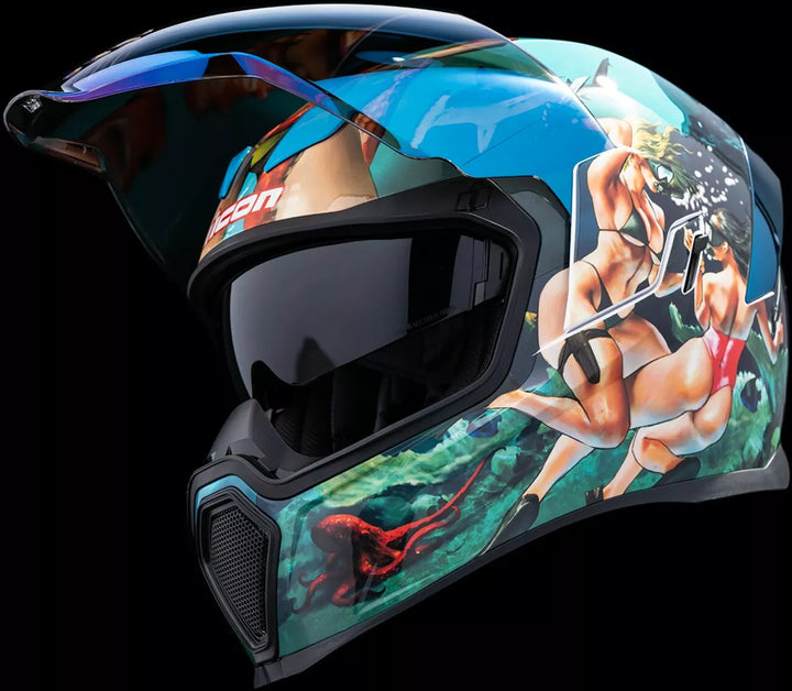 Coquille de polycarbonate moulée par injection pour la résistance, FliteShield sans brouillard à changement rapide avec des plaques latérales, un système de refroidissement du supervent à canal jumeau encastré, un déflecteur de respiration moulé amovible et un rideau de menton, une apport multiple surdimensionné et une apport exversié. Interrupteur extérieur, la visière DropShield ™ ne doit être utilisée que tandis que le bouclier facial principal est en position entièrement fermée, la doublure de mèche d'humidité Hydradry ™ amovible, les poches internes de haut-parleurs fonctionnent avec R.A.U.U. d'Icon. Le dispositif Bluetooth, comprend Clear & RST Blue FliteShield ™, comprend Dark Smoke DropShield ™