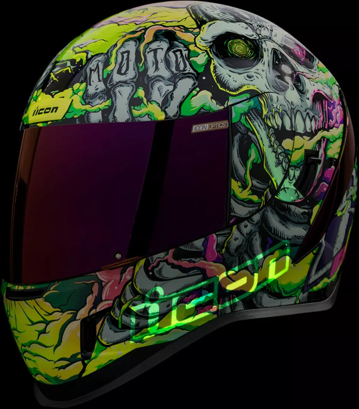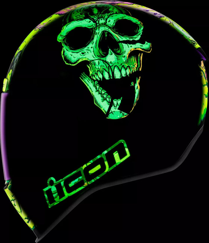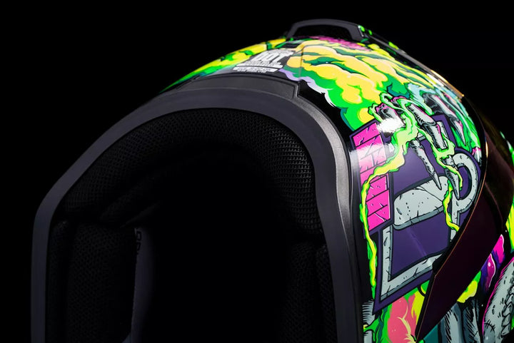 Injection-Molded Polycarbonate Shell for Strength and Durability, Intermediate Headform, Clear Fog-Free Optics ™ Shield Installed, Purple RST FAG-FREE OPTICS ™ Shield Included, Dark Smoke Locking System, PHELOK SHID ™ Removable Comfort Liner, Purple RST Spoiler Kit, Glow in the Dark Graphics, Internal Airflow Geometry, Continuous Venting System, Sculpted NECK Roll, FAG-FREE ICON Optics ™ SHIELD est avec un déménageur de respiration moulé amovible, un déflecteur de respiration moulé amovible, le travail de la poche interne de la Pochette avec R.A.U. d'Icon. Périphérique Bluetooth