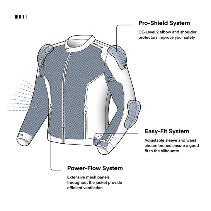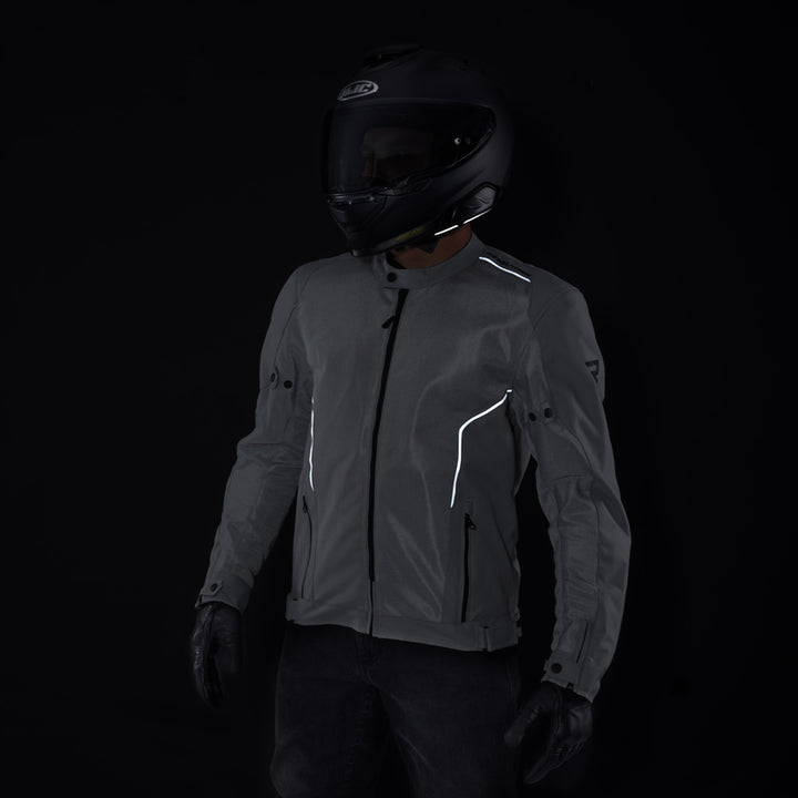 Les éléments réflexes placés dans les zones les plus exposés ainsi que la protection des épaules et des coudes sont responsables de la sécurité du motocycliste.