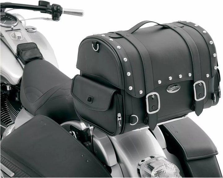 Sac de queue de style élégant avec des sangles, des clous et de grandes boucles chromées, des boucles verrouillables et à couletes rapides cachées sous de grandes boucles chromées, en grain de cuir robuste, des pantalons de renforcement en plastique résistants aux intempéries, conçus pour plusieurs options de montage adaptables à n'importe quel vélo; Fixe à la barre de sissy, à la grille ou au siège passager au sommet, une sangle de bar à poule mouillée facile à utiliser incluse; Plusieurs points d'ancrage, y compris quatre anneaux en D chromés à usage lourd et plusieurs machines à sous fournis pour un montage rapide et facile, une poignée supérieure rivenée et un bandoulion amovible pour un transport pratique hors du vélo, un style de barine de chapeau protte le couvercle facile à ouvrir un accès pratique, deux zippe 12½ "H: 19" L WH POW "