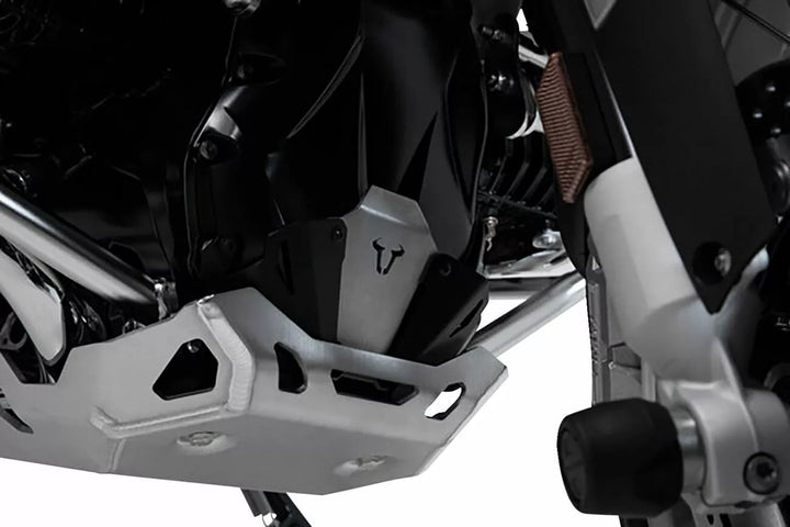 Protège la zone avant du bloc moteur des puces de roche, étend le garde du moteur devant le bloc moteur jusqu'à 130 mm, peut être monté seul ou en plus du gardien de moteur SW-Motech, comprend du matériel de montage et des instructions