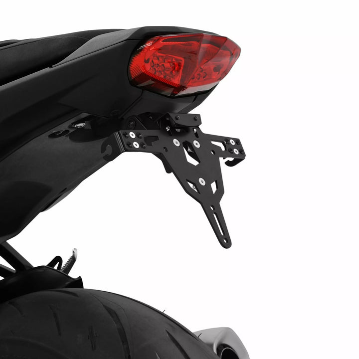 Le support de plaque d'immatriculation est extrêmement durable et à l'épreuve des intempéries., Black Powder enduit. , Le support de plaque d'immatriculation peut être utilisé pour tout type de plaque d'immatriculation (largeur de 175 mm)., Aucune modification du carénage requise., Réglage sans étape de l'angle de râteau., Prise en charge de l'indicateur réglable en 3 positions. Plaque., Supports d'éclairage indicateur spécial (vendus séparément) requis pour les voyants d'indicateur de stock., Kit comprend: 1 porte-plaque d'immatriculation incl. Kit de montage., Light Plaque d'immatriculation LED "E approuvé" incl. Support., Back Light avec support.