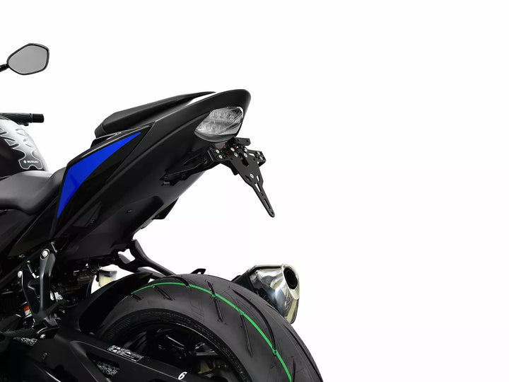 Le support de plaque d'immatriculation est extrêmement durable et à l'épreuve des intempéries., Black Powder enduit. , Le support de plaque d'immatriculation peut être utilisé pour tout type de plaque d'immatriculation (largeur de 175 mm)., Aucune modification du carénage requise., Réglage sans étape de l'angle de râteau., Prise en charge de l'indicateur réglable en 3 positions. Plaque., Supports d'éclairage indicateur spécial (vendus séparément) requis pour les voyants d'indicateur de stock., Kit comprend: 1 porte-plaque d'immatriculation incl. Kit de montage., Light Plaque d'immatriculation LED "E approuvé" incl. Support., Back Light avec support.