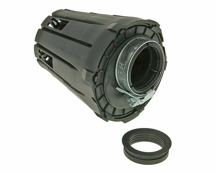 Spray beschermd luchtfilter met een zwarte behuizing en een rood filtergaas.
