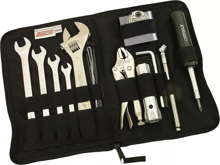 Provides Combination wrenches, an adjustable wrench, lureing pliers, 6-in-1 screwdriver, kick plug wrench, tire gauge, duct tape, zip ties, mechanics wire, and a shop towel, all organized in a heavy-duty zipper pouch Kawasaki, Yamaha and Suzuki, Light Weight and Very Compact for Road or Trail-Side Repairs and Adjustments, A High-Quality Upgrade From an Oem Tool Kit For Motorfiets, ATV en Snow, Lifetime Garantie-geen Quitions-No-vragen gesteld