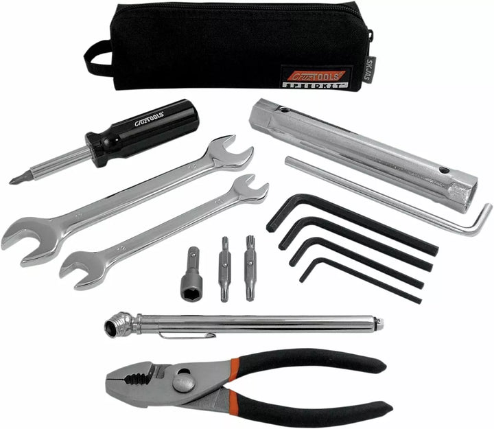 Ultra-Compact Tool Kit Packed With Functionality for Metric Motorcycles, UTV, ATV, Snowmobiles, Snow Bikes, and Personal Watercraft, Dimensions Are Approximately 7 "X 2" X 2 ", Kit Includes, 10x12 mm Open End Wrench, 14x17 mm combo Spark plug wrench with liver, mini 5-in-1 screwdriver with torx t20, 25, 27, 30 bits, hex keys: 3, 4, 5, 6 mm, 10-50 psi bandenmeter, 5,5 "slip-job-job tang, zware ritssluiting, levenslange