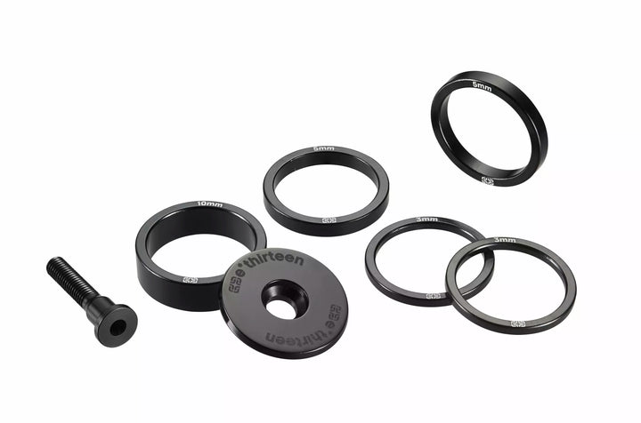 Leg je rit op met E*Thirteen's Top Cap & Headset Spacer Kit! , Verminder het gewicht en voeg hoogwaardige stijl toe terwijl je je cockpit verfijnt. , Ervaar een verhoogde sterkte en prestaties met geanodiseerde legering bovenkap en 7075 AL Bolt. , De lichtgewicht, low-profile legeringsopkap integreert perfect met E*dertien stengels, maar is even thuis op de meeste stengels op de markt. , Bouten zijn briljant geanodiseerd in kleuren die overeenkomen met E*dertien plus stengels en andere componenten. , T25 Hardware betekent enkele toolaanpassingen van elk deel van uw E*dertien bar/stengelconstructie., 5 zwarte geanodiseerde legeringsheadsetafstandspaciers in meerdere maten zorgen voor de ultieme flexibiliteit in stijging aanpassing. , Maat: 34,8 mm diameter., Gewicht: 33 g/kit., Bereik van levering: bovenkap, stuurbout, 1x10 mm, 2x5 mm en 2x3 mm zwarte geanodiseerde legeringsheadset spacers.