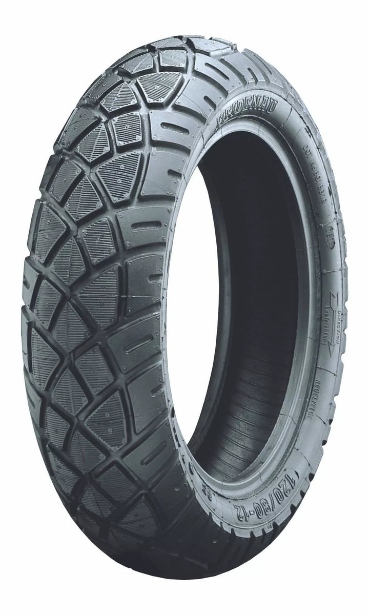 Scooter-band met vier seizoenen, gemodificeerd van standaard K58 voor verschillende groottetoepassingen, open traktatieblokken voor superieure drainage, uitstekende grip, zelfs wanneer nat, tubeless (TL), blackwall, m-rating voor snelheden tot 130 km/u (81 mph).