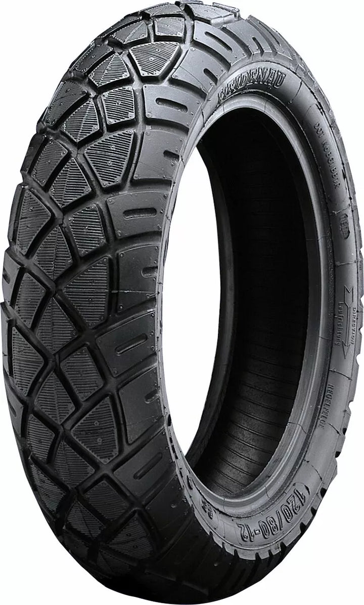 Scooter-band met vier seizoenen, gemodificeerd van standaard K58 voor verschillende groottetoepassingen, open traktatieblokken voor superieure drainage, uitstekende grip, zelfs wanneer nat, tubeless (TL), blackwall, m-rating voor snelheden tot 130 km/u (81 mph).