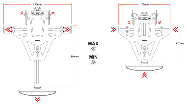 Deze pro-versie van de Highsider Akron-RS omvat het zeer kleine, hoogwaardige aluminium highsider kentekenplaat met montageplaat en ondersteuningsarm. De beugel is in hoogte verstelbaar en zo ontworpen dat deze in de wettelijk voorgeschreven positie kan worden gemonteerd.
