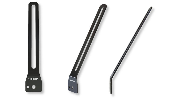 Zwarte stalen houder met highsider-logo voor directe montage van verschillende reflectoren bij de Akron-RS-kentekenplaathouder.