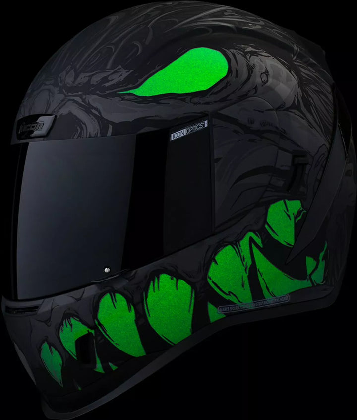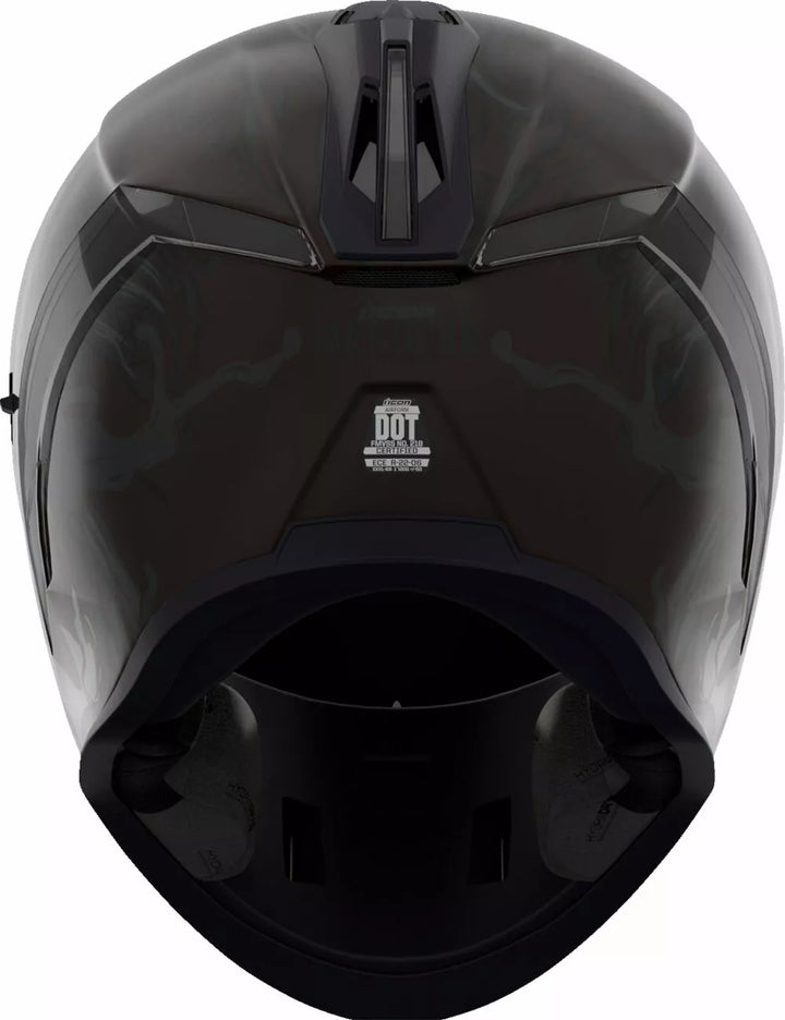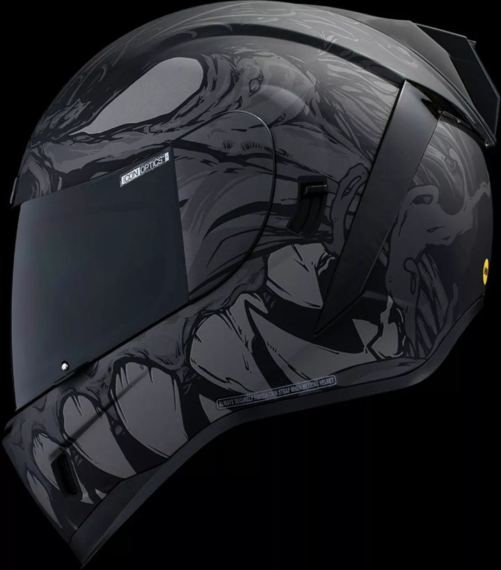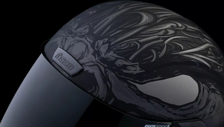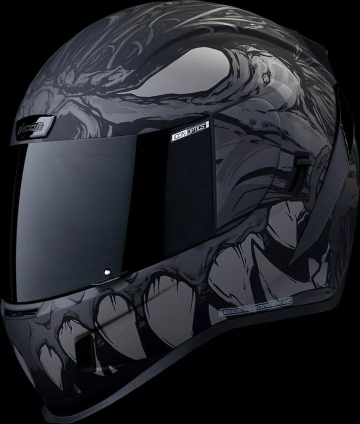 Continu venting-systeem, FAG-vrij pictogram Optics ™ Shield met Rapid-Release ™ -systeem, spuitgegoten polycarbonaatschaal voor sterkte, interne luchtstroomgeometrie, gebeeldhouwde nekrol, prolock ™ switssch, de buitenkant met vergrendeling Swequ-vizier moet alleen worden gebruikt terwijl het belangrijkste gezichtsscherm is in de hoofdtekst in de kiezelachtige hydry ™ 3-pie-vochtige vochtige vochtige vochtige vochtige vochtige vochtige hydry ™ 3-pie-vochtige vochtige vochtige hydry ™ 3-pie-vochtige vochtige vochtige hydry € Voering, interne luidsprekerzakken werken met Icon's R.A.U. Bluetooth -apparaat, inclusief Dark Smoke Dropshield ™ en Rubatone Black SpeedFin ™