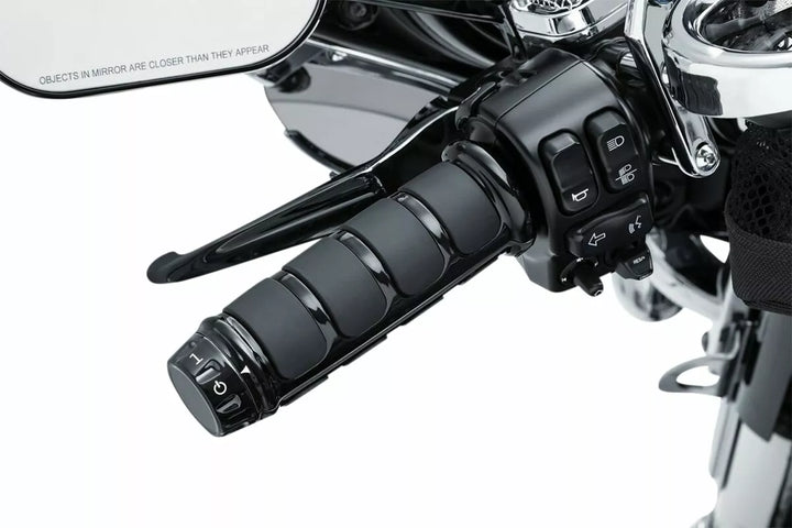Drie-delige clamshell-ontwerp met eindkap is eenvoudig te installeren direct over de door de fabriek verwarmde grepen, behoudt alle fabrieksverwarmingsmogelijkheden, grepen worden gemaakt van kwaliteitsaluminium met zachte, duurzame EPDM-rubber en duur, rubberen inzetstukken, rubberen inzetstuk