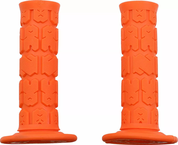 Grotere greepdiameter biedt extra vulling, robuust oppervlaktepatroon biedt een betere tractie in alle omstandigheden, extra grote verhoogde pads leveren uitstekende schokabsorptie en controle, diep groeven kanaal weg vuil en puin