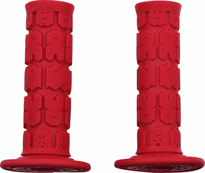 Grotere greepdiameter biedt extra vulling, robuust oppervlaktepatroon biedt een betere tractie in alle omstandigheden, extra grote verhoogde pads leveren uitstekende schokabsorptie en controle, diep groeven kanaal weg vuil en puin