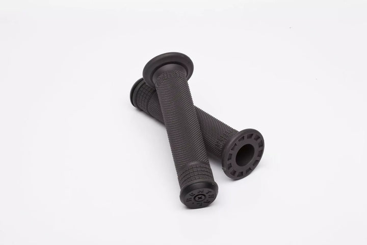 Renthal® Push-on Grips zijn een enkele samengestelde grip die is ontworpen voor de eisen van Trail, Enduro, Downhill, XC, BMX en Ebikes. , De stuurgrip is uw belangrijkste contactpunt voor het besturen van uw fiets. , Het hebben van grip die geschikt is voor uw individuele eisen is enorm belangrijk. Het dubbele podiumpatroon biedt maximale gripprestaties en duurzaamheid, terwijl het vasthoudende rijdergevoel is., Renthal® Push-on Grips zijn ontworpen om tante te rijden, verder te springen en langer te laden. Rand voor duurzaamheid., Gemiddelde flens voor extra controle en shifter-compatibiliteit., Gekweldgreep sectie voor ultieme controle., Veilig, expander eindplugs., 135 mm lengte.