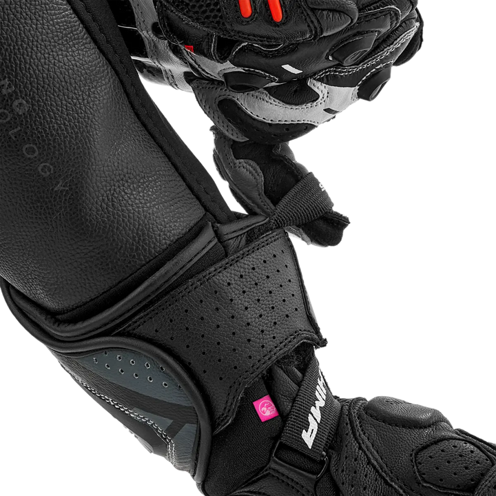 Gemaakt van duurzaam geitleer en versterkt met Superlastische en duurzame kangoeroeine in de palm. Ze zitten vol met Koolstofvezelversterkte knokkelbescherming, SAP Handglaasjes, Mini glijdt bij de pink En Pantservulling op gevoelige zones. De vooraf gevormde vingers met vingerzetting tussen ring en pink beschermen de hand wanneer u contact opneemt met het asfalt.