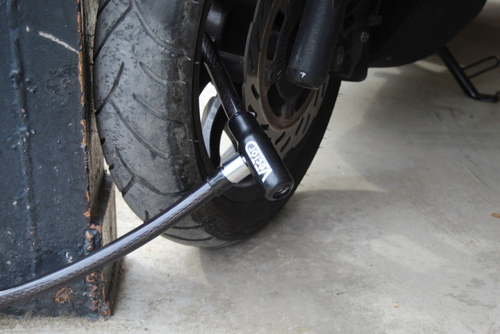 Vector Max Lock is een Robuust en duurzaam draadslot, perfect voor het beveiligen van motorfietsen, fietsen en andere voertuigen. Met één 20 mm dikke gevlochten stalen kabels en vinylcoating, combineert dit slot Hoge beveiliging met een soepele handling.