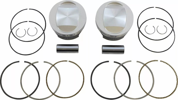 Forged Piston Crown with Genrous Valve Pockets for Big Valves and Cams, Precision-Fit Rings Selected for Each Application for Ultimate Sealing, Force-Fed Pin Oiling Provides Enhanced Lubrication of the Piston Pin, Power Power Lights, Ring Linduces Rima, Coating Reduces Friction, Providing Quiester Operation and Improving Scuff Resistance, Valued-Packaged with Two Pistons, Rings, Piston Pins and Circips, Zuiger is gemaakt in de VS.